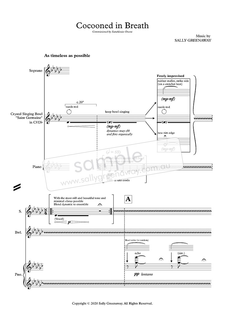 The piece is centred on the bowl Saint Germaine which is pitched to 4 4 and has an overtone of a 5. The instrument is played traditionally with a suede rod and rubber or felt mallet, but the performer is invited to explore the modern percussion technique of bowing the rim of the bowl. They are to free explore the sound world of the bowl that these playing options provide in order to ebb and flow with the dynamics and energy throughout the duration of the piece.